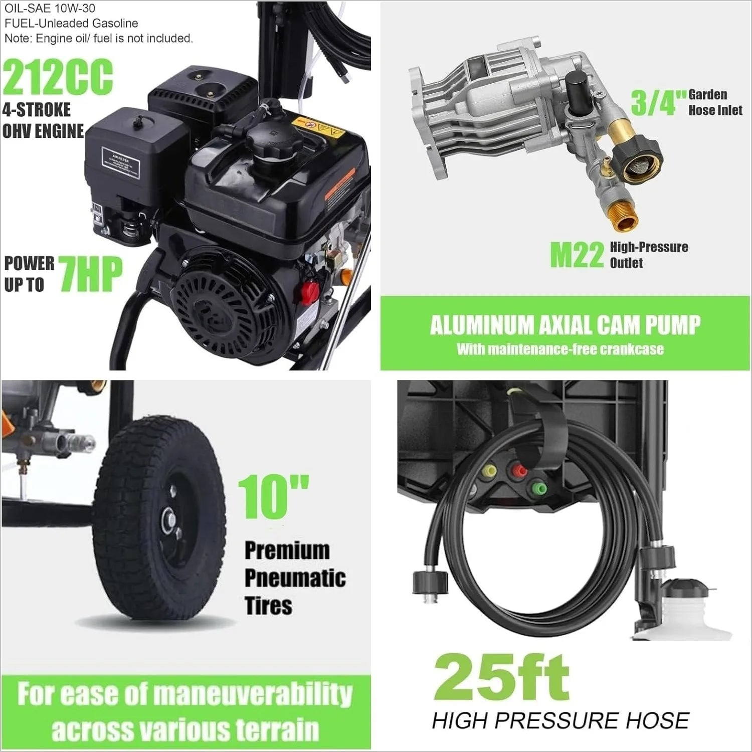 - Efficient Gasoline Engine: 7HP, 212cc 4-stroke engine with recoil start and a durable axial cam pump. Rugged, reliable, easy to start, and designed for years of demanding use. CARB compliant.